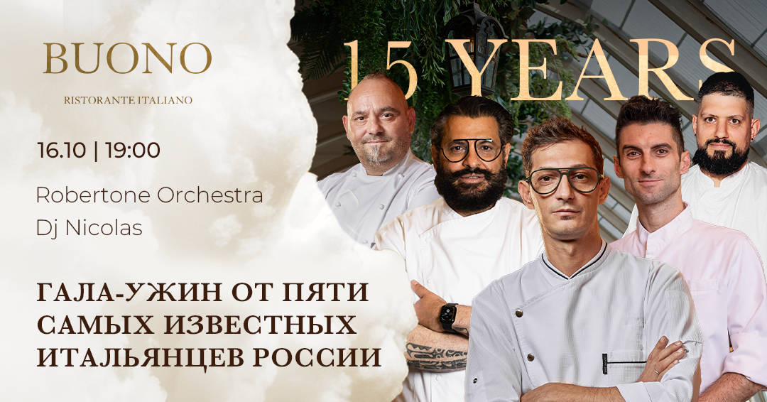 16 октября в 19:00 состоится эксклюзивный ужин в формате гастрономического путешествия сквозь времена: сет-меню из 6 подач и гастрономических комплементов приготовят все звездные шеф-повара, когда-либо возглавлявшие кухню BUONO. Таким образом знаковый панорамный ресторан на последних этажах Radisson Collection Hotel, Moscowотмечает 15-летний юбилей. За это время кухней проекта руководили 5 итальянцев, которые не нуждаются в представлении: Уиллиам Ламберти, Кристиан Лоренцини, Андреа Галли, Алессандро Симиоли и Джузеппе Дави, ныне отвечающий за акценты итальянских регионов в BUONO. Атмосферным дополнением уникального события станет концерт живой музыки от Роберто Кардилло и музыкантов оркестра «OrchestraItaliana», а также DJ Nicolas. Эксклюзивный ужин продемонстрирует шефскую преемственность и разные грани итальянской кухни, рассмотренной сквозь призму авторского взгляда. Сбор гостей назначен на 19:00.