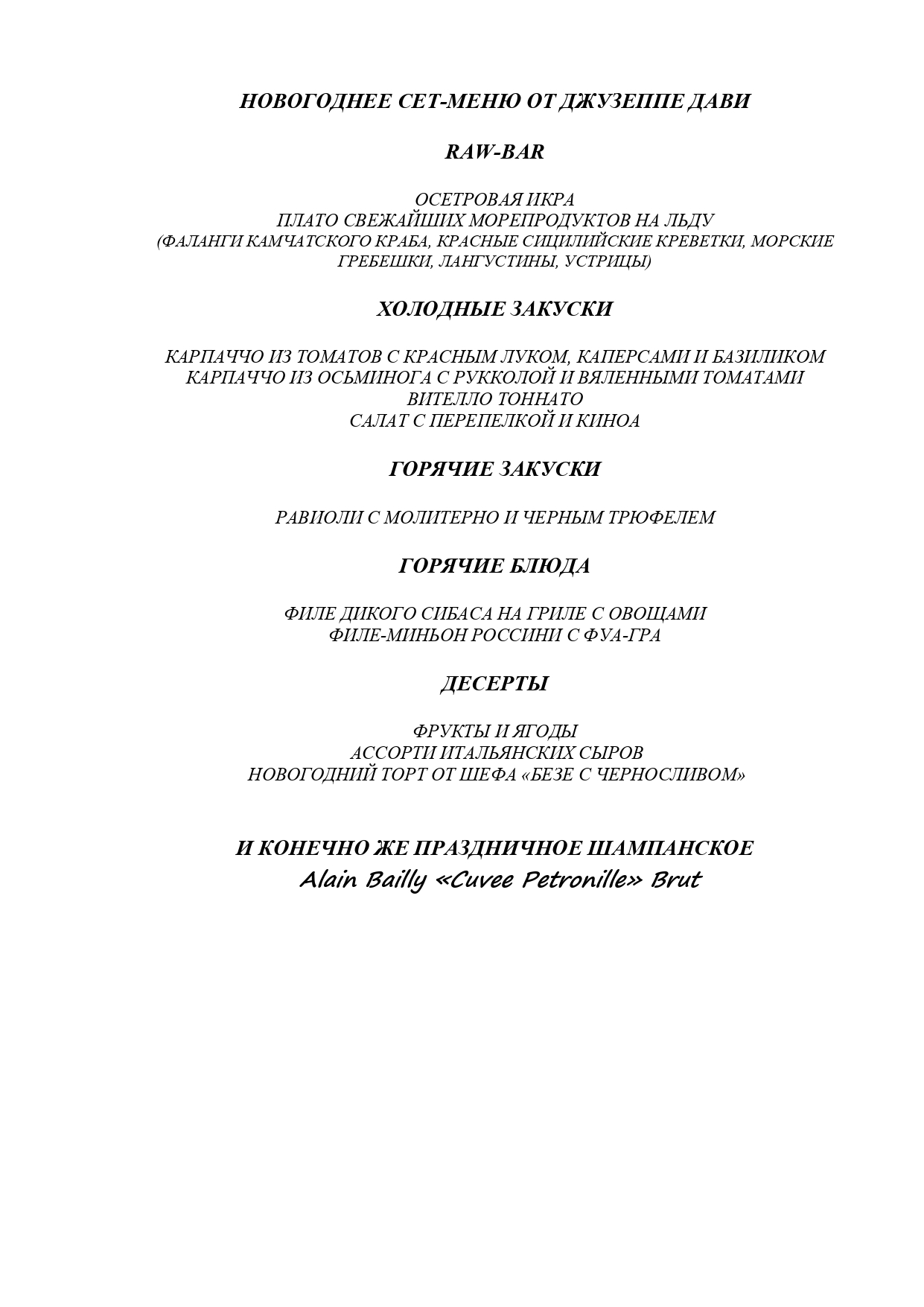 Гастрономическим сопровождением праздника станет особое меню от бренд-шефа проекта Джузеппе Дави. Джузеппе собрал сет-лист из эксклюзивных позиций, большая часть которых не числится в повседневном списке ресторана. Среди новогодних специалитетов - RAW-bar с осетровой икрой и плато морепродуктов на льду, итальянские сыры, карпаччо из осьминога, равиоли с выдержанным сыром молитерно с трюфелем, филе миньон «Россини» с фуа-гра, дикий сибас на гриле и другие блюда. Сет завершает новогодний торт по авторскому рецепту Джузеппе - в воздушном безе с черносливом деликатно объединились главные сладкие вкусы, ассоциирующиеся с боем курантов. Загадывать желание гостям предложат под бокалы с шампанским Alain Bailly Cuvee Petronille Brut - праздничным, сочным, с ароматами свежего зеленого яблока, груши и персика.