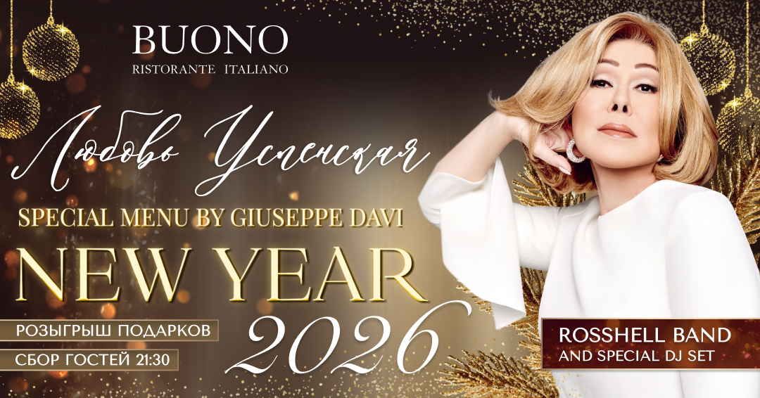 Новогодняя ночь BUONO задумана в основном зале и террасах с 360-градусной панорамой на праздничный город и ночные огни, гирляндами усыпавшие все центральные улицы, где встреча 2026-го пройдет в атмосфере, воссозданной со страниц рождественских сказок: припорошенные искрящимся снегом украшения, дизайнерская елка с подарками и гирляндами, елочные шары из цветного стекла и элегантный шик итальянского романтизма. Вечер начнется с яркого концерта cover band от резидентов Roshell. После полуночи на сцену выйдет Любовь Успенская и исполнит всем известные хиты любимые поколениями.